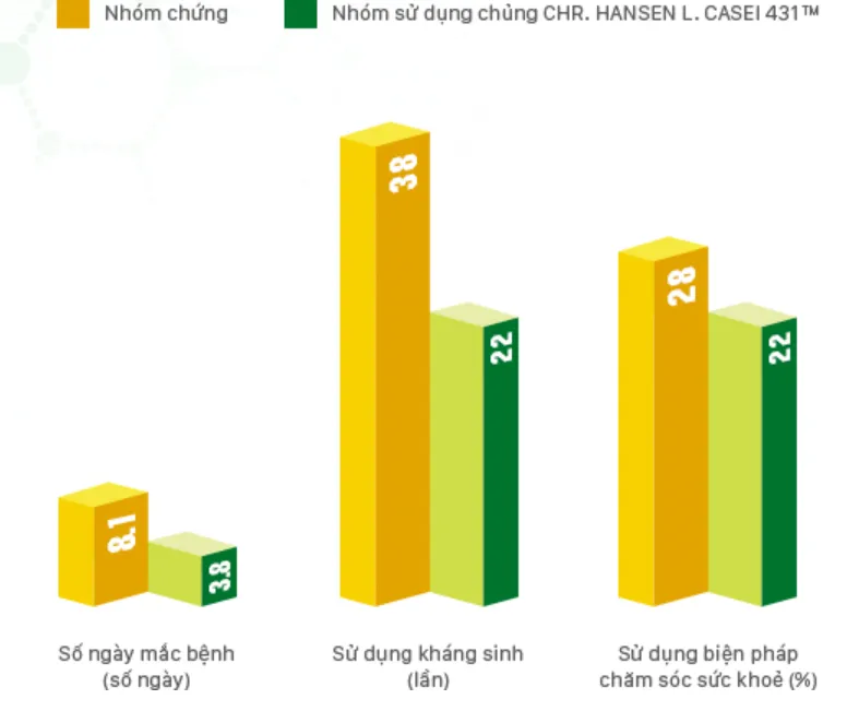 Năm 2011, Tập đoàn men sống hiện đại Châu Âu - CHR Hansen (Đan Mạch) đã tiến hành thử nghiệm trên 1.100 đối tượng tại Đan Mạch và Đức... với mục đích tìm hiểu tác động của chủng men L. CASEI 431™ trong việc phòng ngừa cảm cúm. Trải qua 2 năm tiến hành, nghiên cứu này đã chứng minh được việc sử dụng chủng men L. CASEI 431™ có thể giúp rút ngắn thời gian bị cảm cúm và bệnh cảm thông thường với số ngày bệnh giảm từ 8.1 ngày (đối với nhóm dùng giả dược) xuống còn 4.8 ngày; đồng thời làm giảm việc sử dụng thuốc kháng sinh từ 38 lần xuống chỉ còn 22 lần. Không những thế, các nhà khoa học cũng thấy được, chủng men này còn giúp giảm việc sử dụng các biện pháp chăm sóc sức khỏe (chỉ 22% so với nhóm dùng giả dược là 28%).