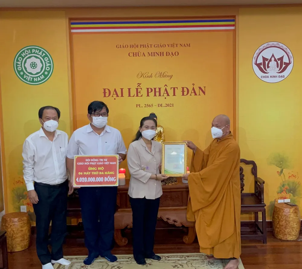 Ngày 23-7, tại chùa Minh Đạo, phường 9 (quận 3), Hòa thượng Thích Thiện Nhơn, Chủ tịch Hội đồng Trị sự Giáo hội Phật giáo Việt Nam, thay mặt Trung ương Giáo hội Phật giáo Việt Nam trao tặng 6 máy thở đa năng hỗ trợ TPHCM trong công tác điều trị người mắc Covid-19. Số máy thở đa năng này nằm trong 10 máy trị giá 6,7 tỷ đồng do tăng ni, phật tử trong cả nước đóng góp, hỗ trợ TPHCM 6 máy và 2 tỉnh Bình Dương, Long An, mỗi tỉnh 2 máy.