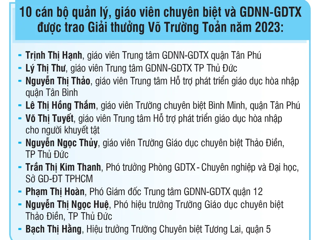 Ngày 16-11, Sở GD-ĐT TPHCM tổ chức gặp mặt 50 nhà giáo là cán bộ quản lý, giáo viên được trao Giải thưởng Võ Trường Toản lần thứ 26 năm 2023. Giải thưởng có sự đồng hành của Báo Sài Gòn Giải Phóng.