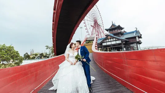 Sắc đỏ ấn tượng của cây cầu, màu xanh mướt mắt của cây cối tại Vườn Nhật tiệp với sắc trắng tinh khôi, sắc vàng rực rỡ của những tà váy cưới, để khoảnh khắc giữa bạn và “người ấy” trở thành kỷ niệm không thể nào quên.