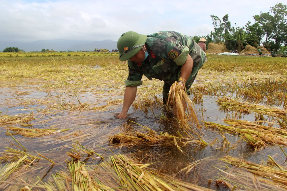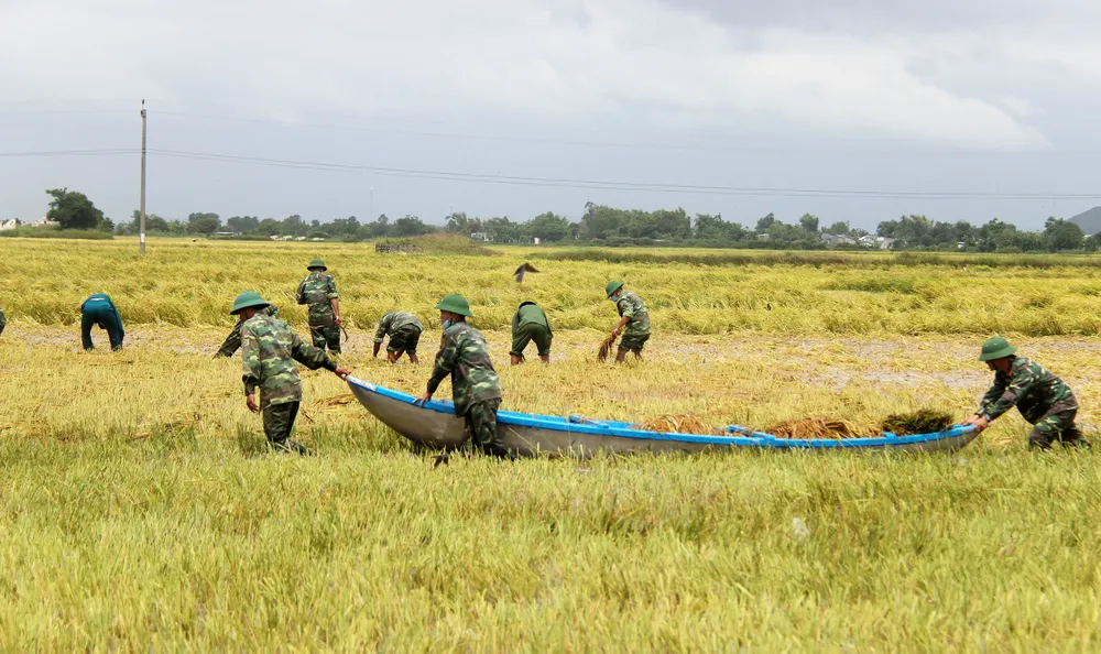 Lực lượng quân đội được huy động để giúp người dân gặt lúa bị ngập nước và đổ ngã