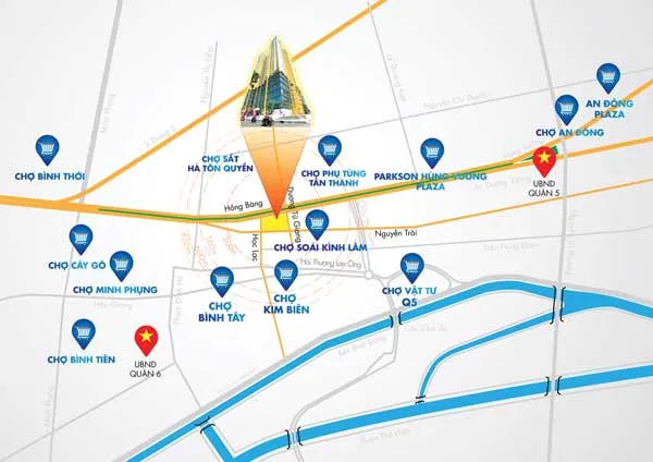 Chính kết nối đặc biệt với khu Chợ Lớn đã tạo thành điểm ấn tượng của TTMS hiện đại này. Xung quanh Golden Plaza là các chợ đầu mối sỉ với giao thương lớn nhất cả nước như chợ Đại Quang Minh, chợ phụ tùng Tân Thành, chợ sắt Hà Tôn Quyền, Soái Kình Lâm, Kim Biên, Bình Tây.