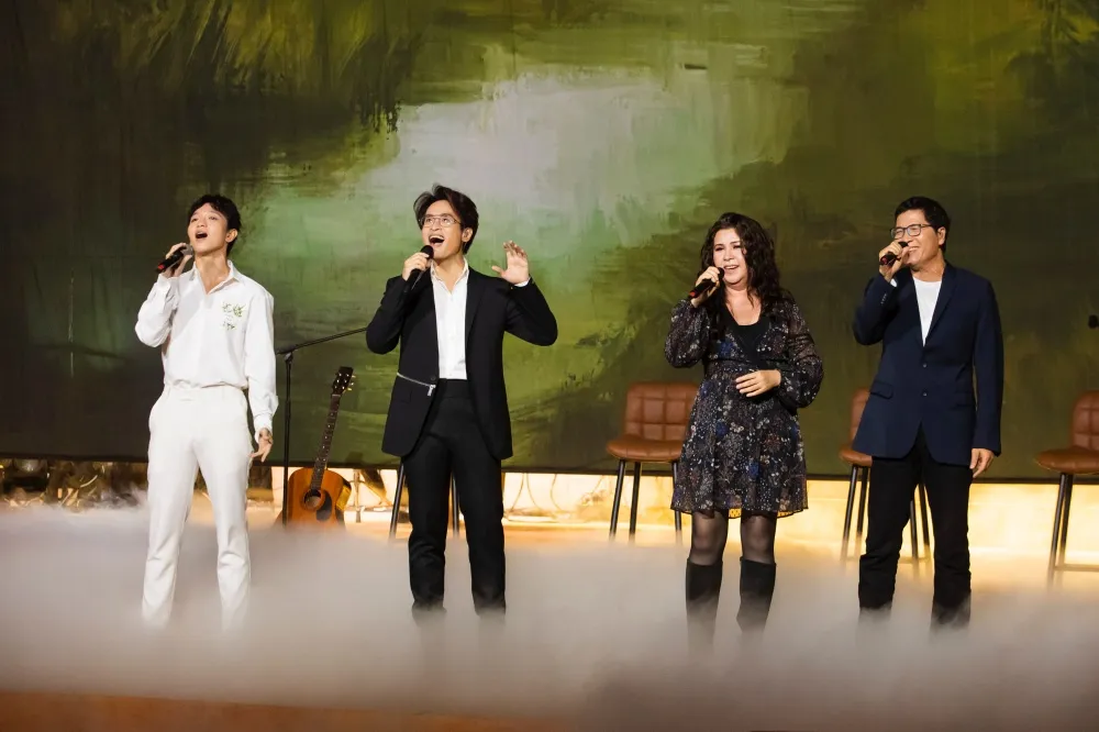 Hà Anh Tuấn và bộ đôi Phương Thảo - Ngọc Lễ hát cùng nhau trong đêm nhạc. Ảnh: ĐẠI NGÔ