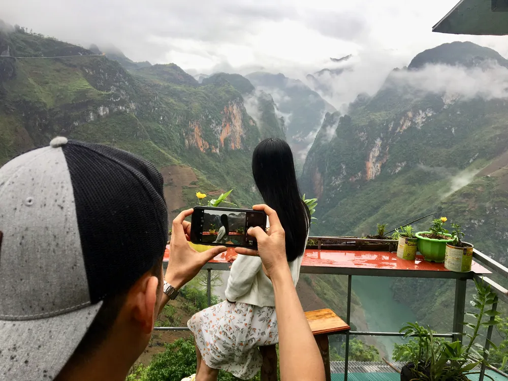 Khách chụp hình tại một quán cà phê nhìn ra dòng sông Nho Quế trong xanh, hiền hòa