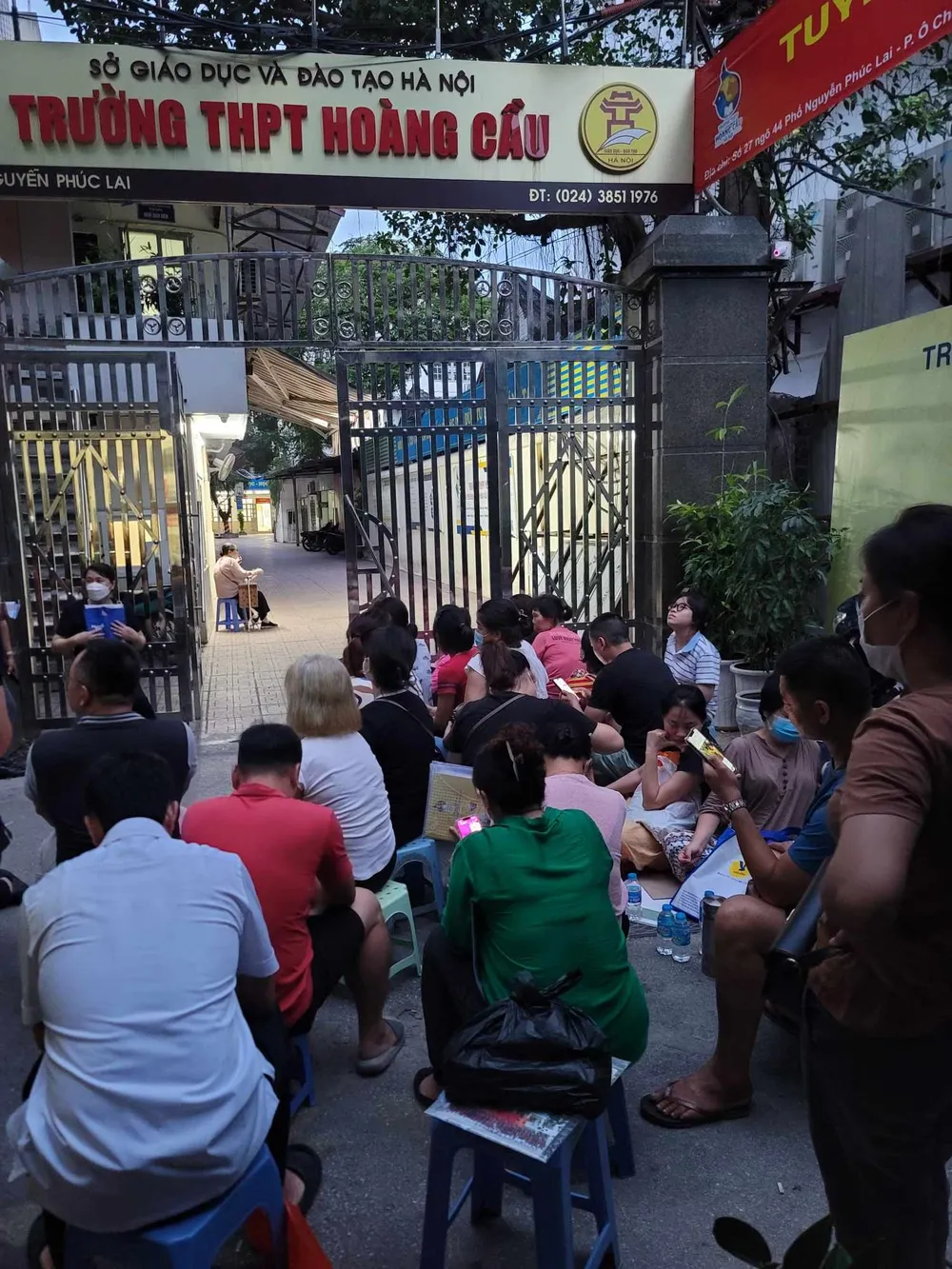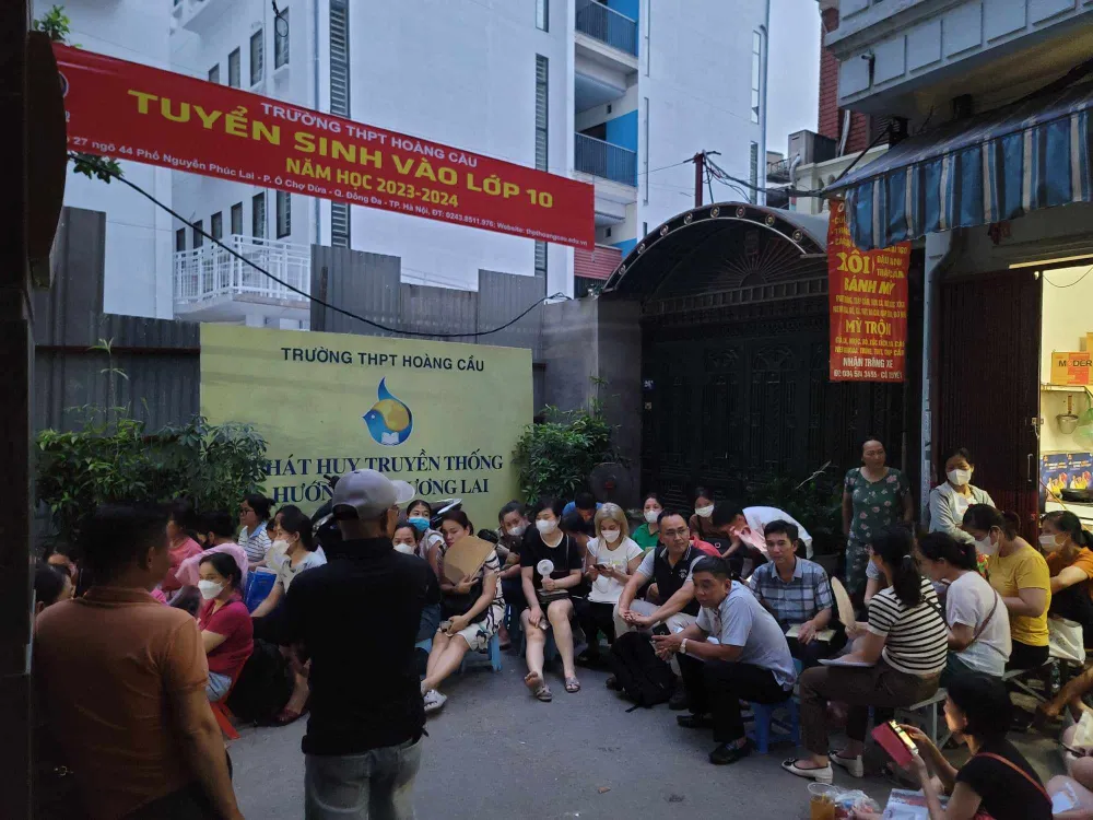 Ghi nhận tại trường THPT Hoàng Cầu (ở phố Nguyễn Phúc Lai, quận Đống Đa, Hà Nội) hoạt động theo mô hình công lập tự chủ tài chính, từ 1 giờ sáng ngày 5-7 đã có rất đông phụ huynh học sinh tới chầu trực, xếp hàng tại cổng trường để chờ nộp hồ sơ cho con vào lớp 10.
