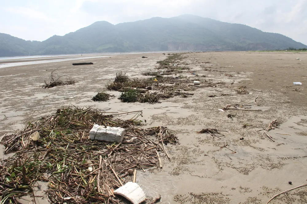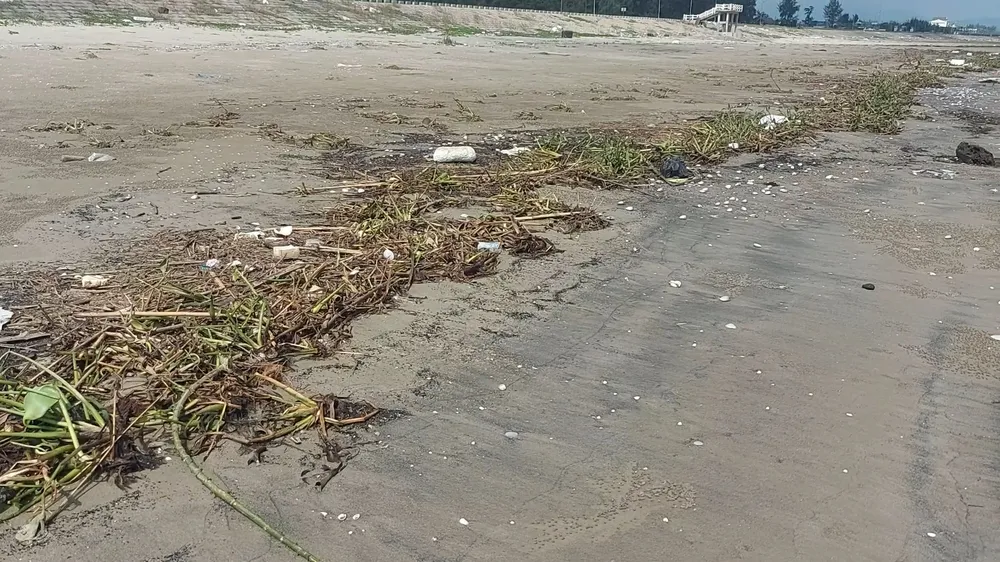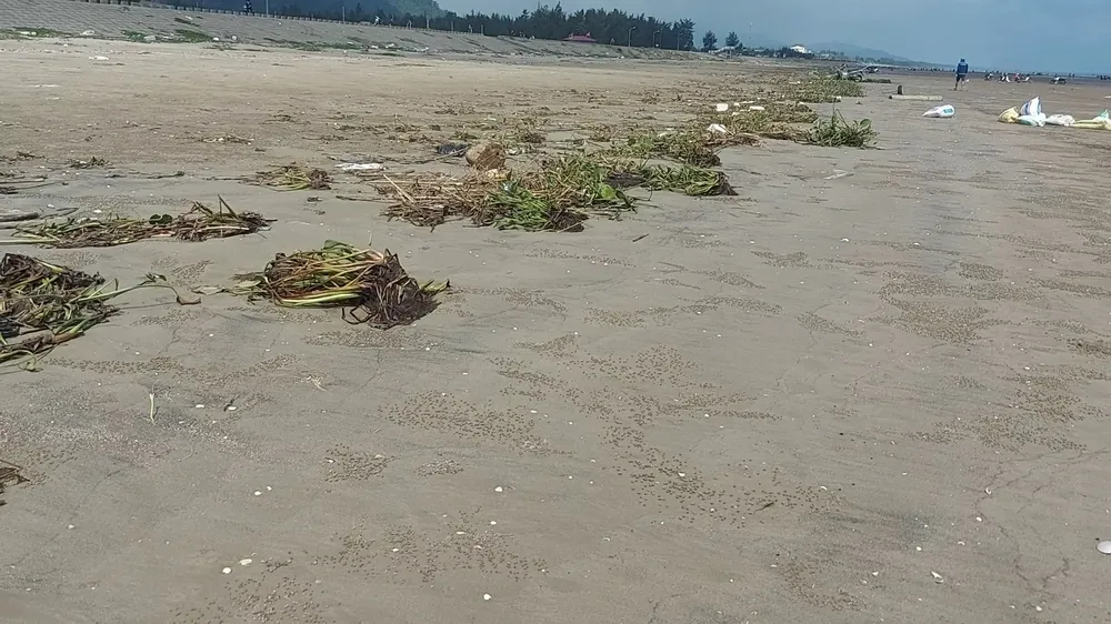 Bèo lục bình dạt vào bãi biển sau mưa lũ vừa qua