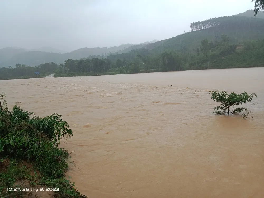 Đến 11 giờ 30 phút ngày 26-9, tại khu vực cầu tràn này, mực nước ngập sâu khoảng 1,5m và đang có mưa to, nước tiếp tục dâng lên.