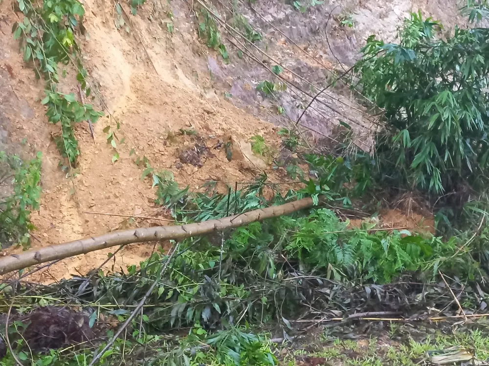 | Đường giao thông đoạn qua bản Rào Tre bị sạt lở, xói bồi đất đá |