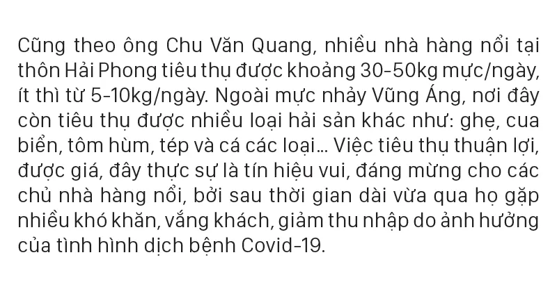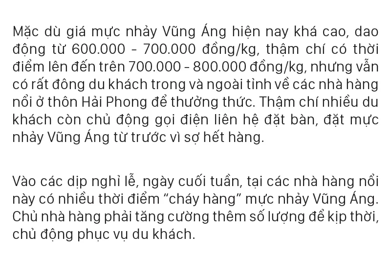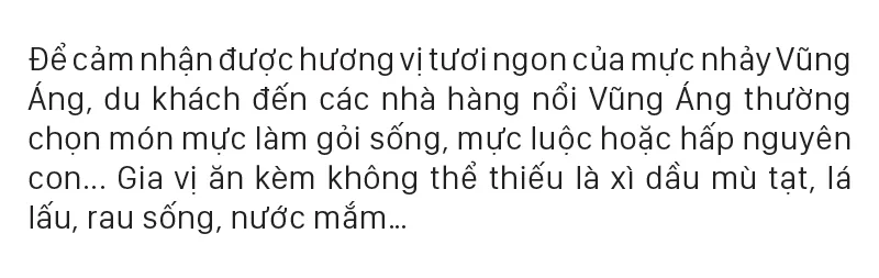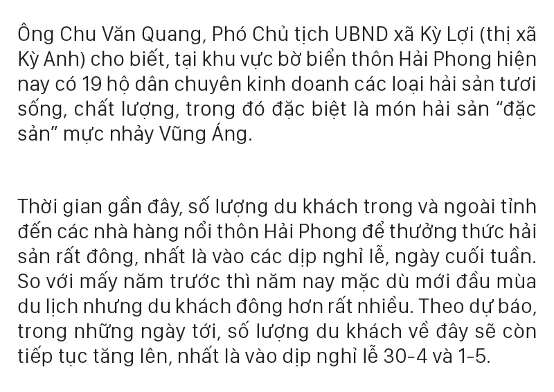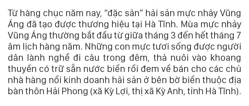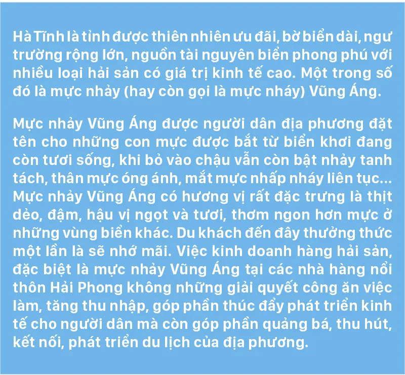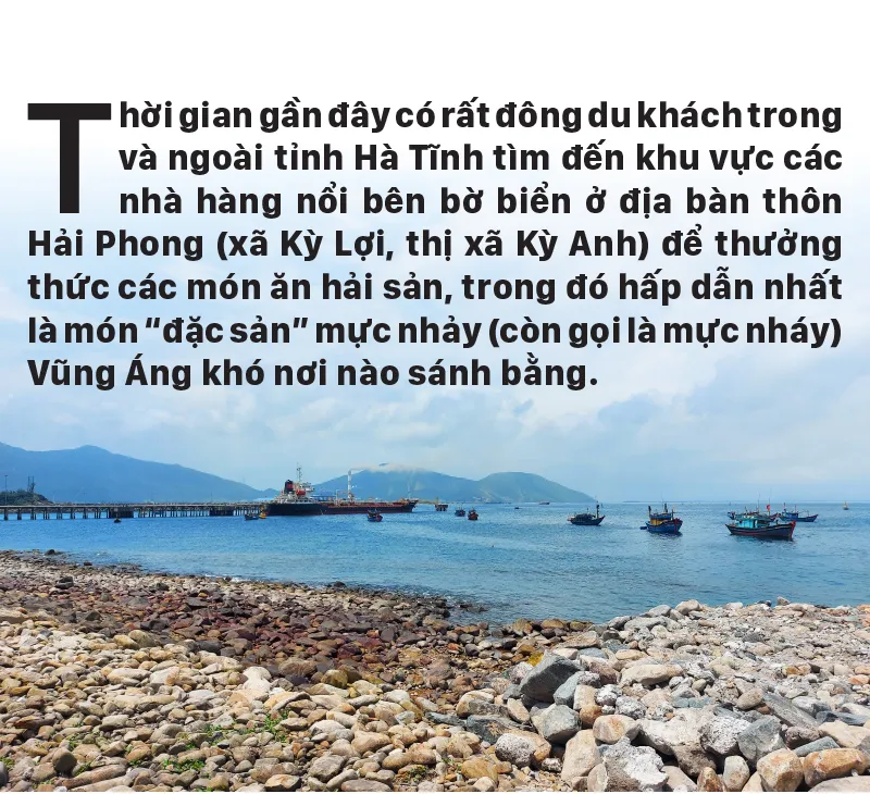 Thời gian gần đây có rất đông du khách trong và ngoài tỉnh Hà Tĩnh tìm đến khu vực các nhà hàng nổi bên bờ biển ở địa bàn thôn Hải Phong (xã Kỳ Lợi, thị xã Kỳ Anh) để thưởng thức các món hải sản, trong đó, hấp dẫn nhất là đặc sản mực nhảy (còn gọi là mực nháy) Vũng Áng khó nơi nào sánh bằng.