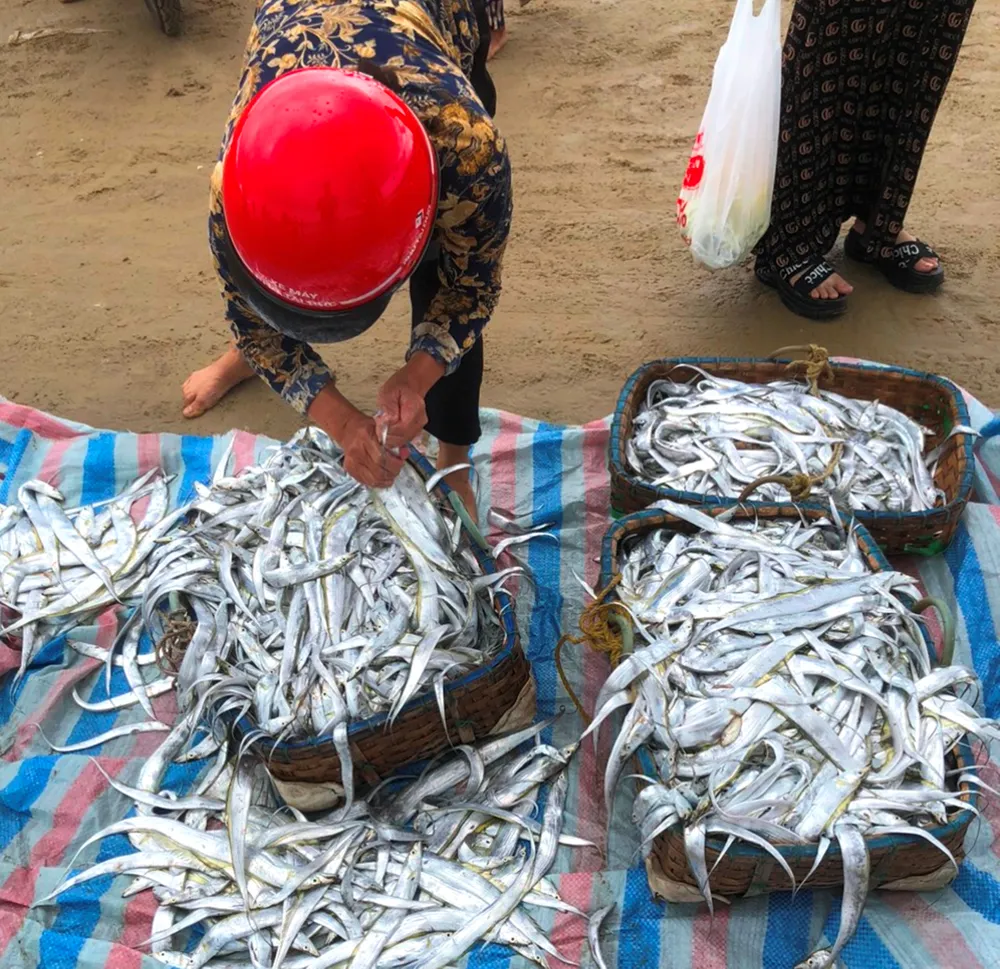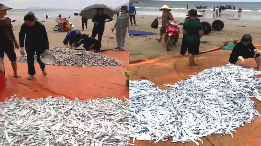 | Cá hố biển được đưa vào bờ biển xã Kỳ Phú |
