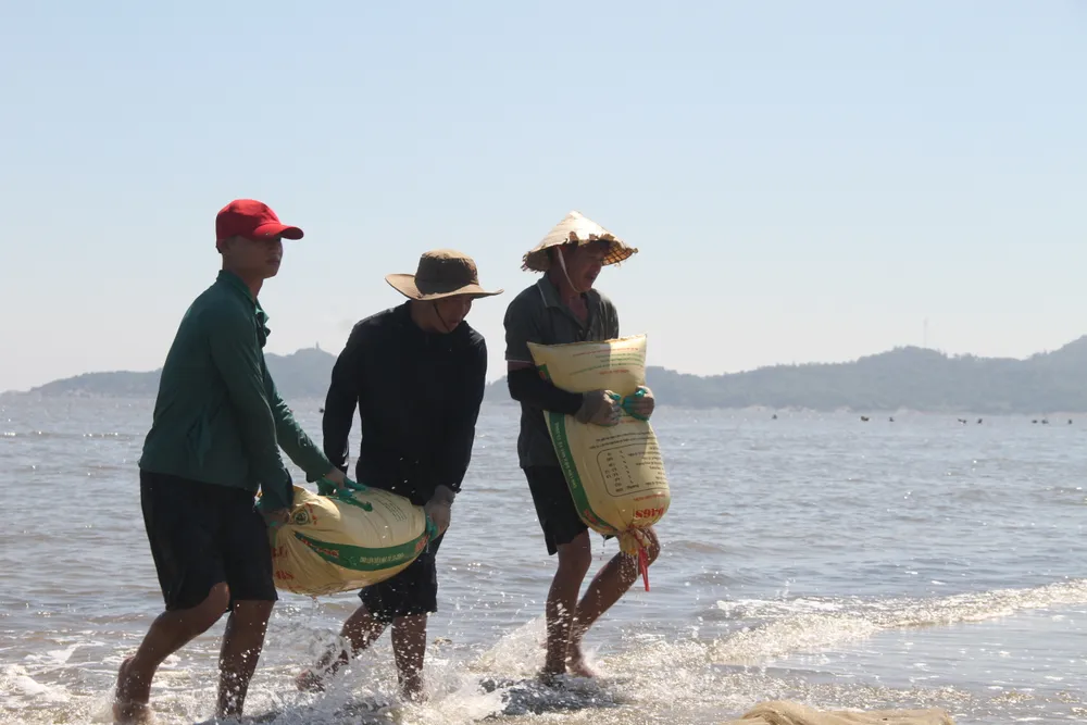 Từng bao tải ốc ruốc đầy ắp lần lượt được những người trẻ khỏe bốc xếp lên chiếc xe công nông đầu ngang đi ra tận bờ biển, tiếp đó ốc ruốc được vận chuyển đưa lên địa điểm tập kết ở trên bờ kè ven biển để bốc lên các thùng xe container đưa đi tiêu thụ.