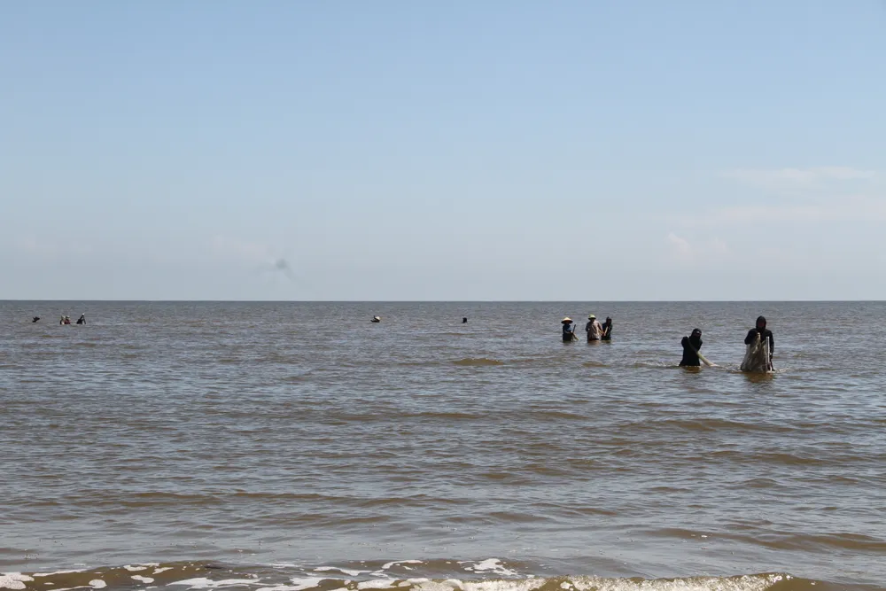 | Người dân lội ra biển ở mực nước ngang bụng để cào bắt ốc ruốc |