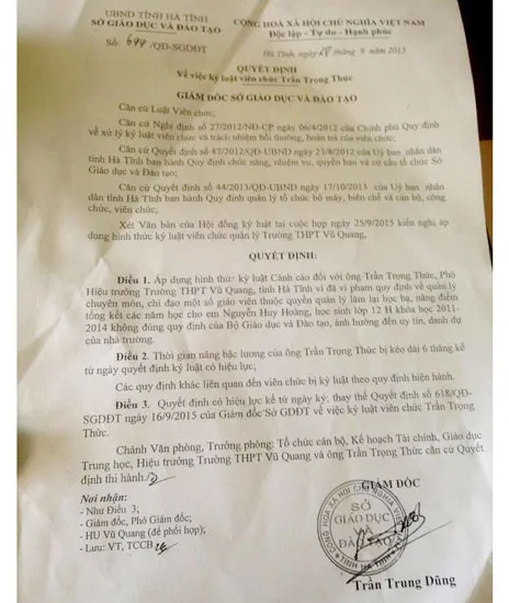 Quyết định kỷ luật của Sở GD-ĐT tỉnh Hà Tĩnh đối với ông Trần Trọng Thức