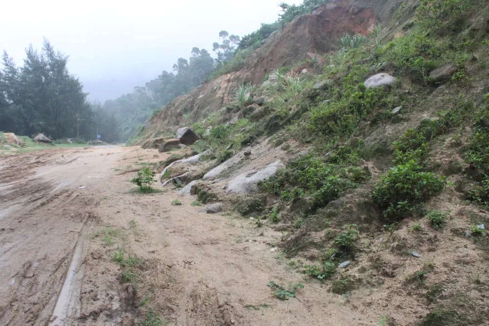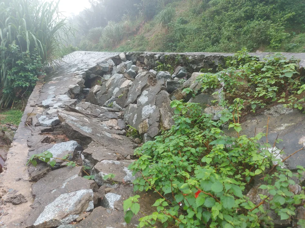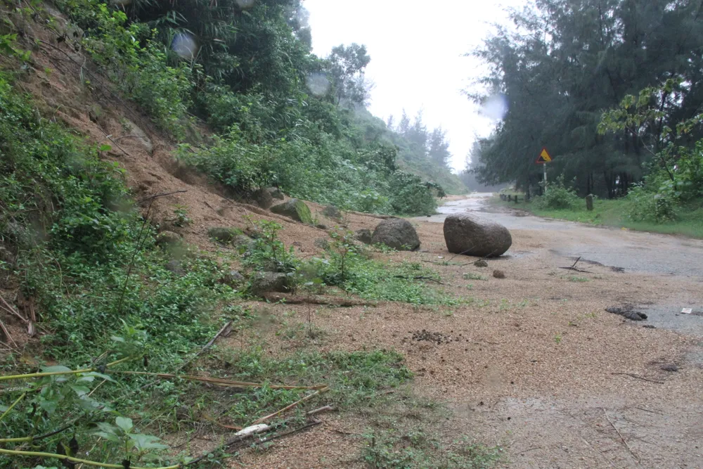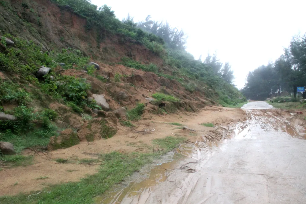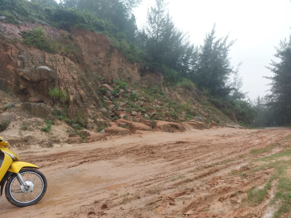 Ngoài ra, dọc phía taluy dương trên tuyến đường quốc phòng ven biển Cẩm Lĩnh - Kỳ Xuân cũng xuất hiện nhiều vị trí sạt lở. Nhiều khối đất đã tràn xuống vùi lấp lòng đường, bùn lầy nhão nhoét khiến các phương tiện lưu thông qua lại gặp khó khăn.