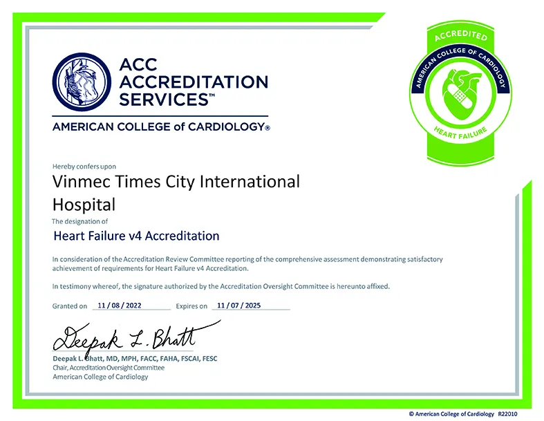 Chứng nhận của American College of Cardiology (ACC) là tiêu chuẩn hàng đầu về quản lý và điều trị các bệnh lý tim mạch, được công nhận trên khắp thế giới với các tiêu chí đánh giá nghiêm ngặt và toàn diện. Sau hơn một năm triển khai thực hiện bộ quy trình quản lý suy tim được xây dựng, chuẩn hóa và cập nhật theo các tiêu chuẩn của ACC, hai Trung tâm Tim mạch thuộc Vinmec Times City (Hà Nội) và Vinmec Central Park (TPHCM) đã được Hội đồng thẩm định ACC công nhận đạt chuẩn về chương trình quản lý suy tim.