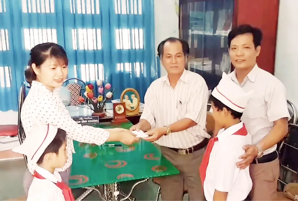 Ngày 9-5, tại Trường Tiểu học Số 1 Phước Hiệp (xã Phước Hiệp, huyện Tuy Phước, tỉnh Bình Định), Ban Giám hiệu của trườngđã bàn giao túi đựng vàng do 2 em học sinh lớp 3 vừa nhặt được cho Công an xã Phước Hiệp để thông báo tìm người đánh rơi.