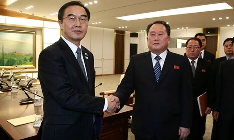 Bộ trưởng Thống nhất Hàn Quốc Cho Myong-gyon (trái) và Chủ tịch Ủy ban Tái thống nhất Hòa bình Triều Tiên Ri Son-gwon bắt tay trong cuộc gặp tại làng đình chiến Panmunjom ngày 9/1. Ảnh: Reuters.
