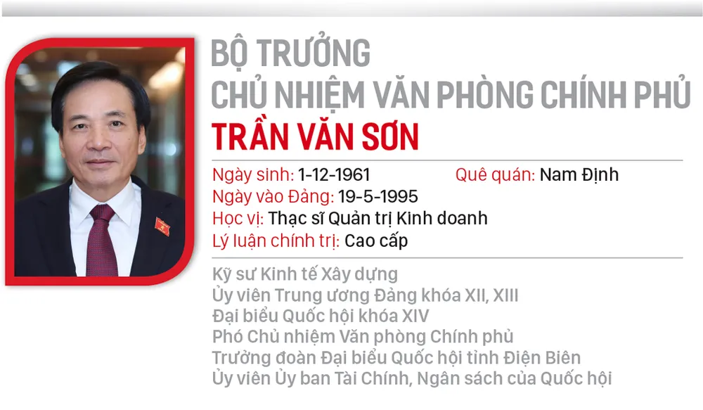 Các Bộ trưởng, thành viên Chính phủ vừa được Quốc hội phê chuẩn gồm: Bộ trưởng Bộ Quốc phòng Phan Văn Giang; Bộ trưởng Bộ Giáo dục và Đào tạo Nguyễn Kim Sơn; Bộ trưởng Bộ Xây dựng Nguyễn Thanh Nghị; Bộ trưởng Bộ Nông nghiệp và Phát triển nông thôn Lê Minh Hoan; Bộ trưởng Bộ Ngoại giao Bùi Thanh Sơn; Bộ trưởng Bộ Nội vụ Phạm Thị Thanh Trà; Bộ trưởng Bộ Văn hóa - Thể thao và Du lịch Nguyễn Văn Hùng; Bộ trưởng Bộ Công thương Nguyễn Hồng Diên; Bộ trưởng Bộ Tài chính Hồ Đức Phớc; Bộ trưởng, Chủ nhiệm Văn phòng Chính phủ Trần Văn Sơn; Tổng Thanh tra Chính phủ Đoàn Hồng Phong và Bộ trưởng - Chủ nhiệm Ủy ban Dân tộc Hầu A Lềnh.