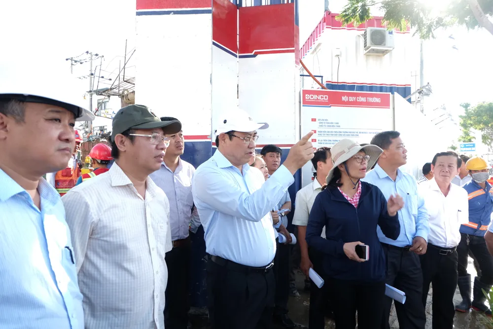 Ông Huỳnh Đức Thơ chỉ đạo đơn vị thi công công trình hầm chui Điện Biên Phủ - Nguyễn Tri Phương phải tăng cường nhân lực, vật lực, phương tiện để đảm bảo tiến độ, đưa công trình vào phục vụ trước 29-10-2017. Ảnh: NGUYÊN KHÔI