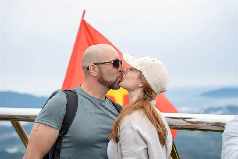 Nhiều cặp đôi khách quốc tế cũng thích thú lưu lại kỷ niệm tình yêu với Cây cầu du lịch biểu tượng hàng đầu thế giới với khung cảnh rực rỡ cờ đỏ sao vàng.