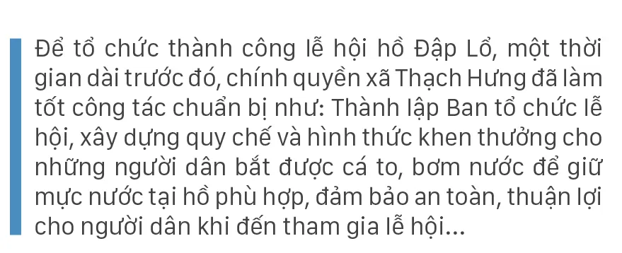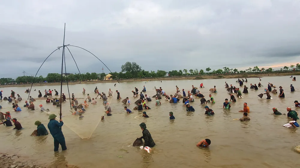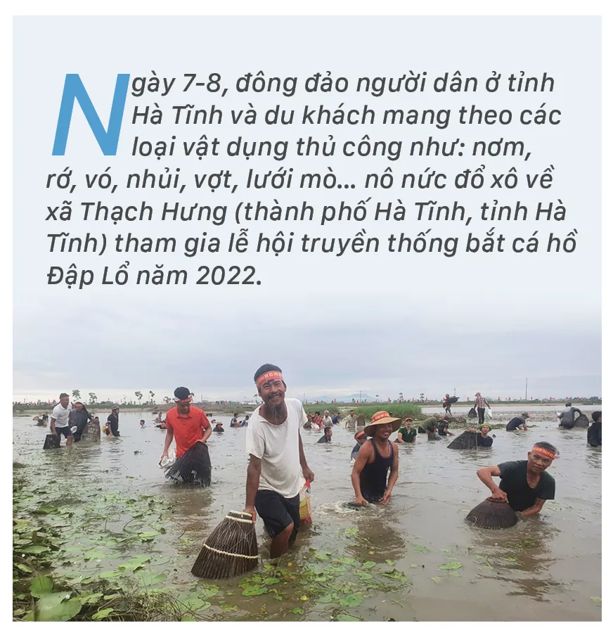 Ngày 7-8, đông đảo người dân ở tỉnh Hà Tĩnh và du khách mang theo các loại vật dụng thủ công như: nơm, rớ, vó, nhủi, vợt, lưới mò… nô nức đổ xô về xã Thạch Hưng (thành phố Hà Tĩnh, tỉnh Hà Tĩnh) tham gia lễ hội truyền thống bắt cá hồ Đập Lổ năm 2022.