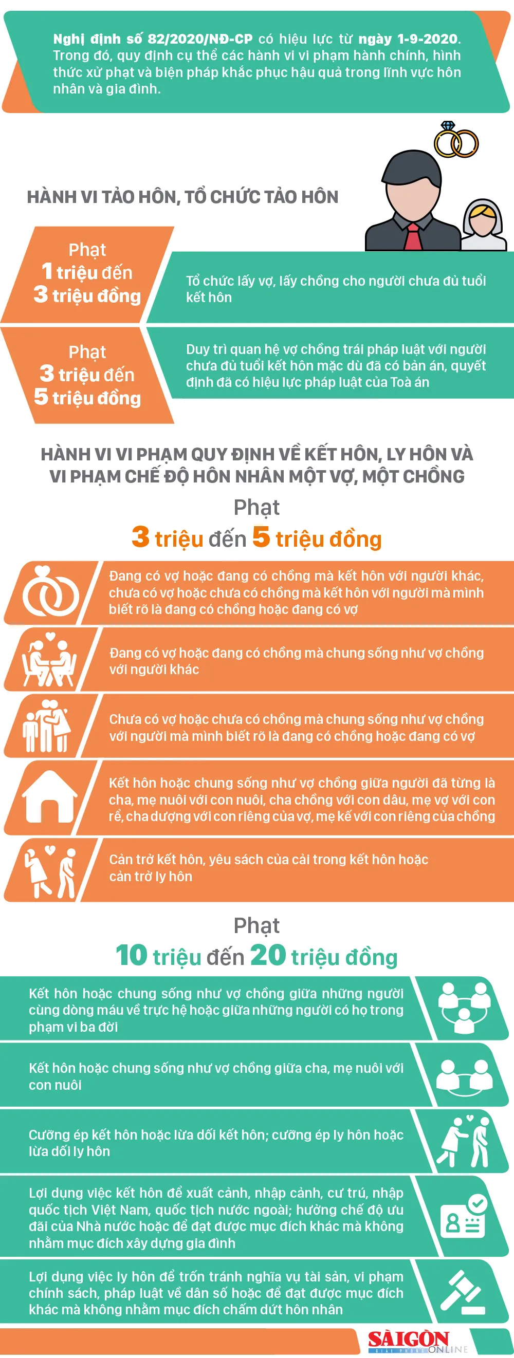 Nghị định số 82/2020/NĐ-CP có hiệu lực từ ngày 1-9-2020. Theo đó, con nuôi kết hôn với cha mẹ nuôi, cưỡng ép hoặc lừa dối kết hôn, cưỡng ép hoặc lừa dối ly hôn... sẽ bị phạt từ 10 triệu đến 20 triệu đồng.