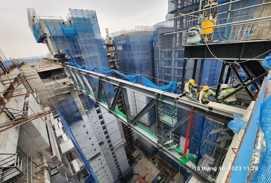Hệ module chính của hạng mục Sky Bridge nặng 47 tấn được lắp đặt tại tầng 6 của dự án và sau đó nâng lên liên tục trong vòng gần 22 tiếng bởi công nghệ nâng sử dụng Strand Jack – một trong những công nghệ thi công nâng siêu trọng (Heavy Lifting) tiên tiến hiện nay.