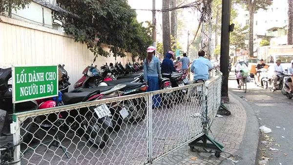Tương tự, toàn bộ vỉa hè tại giao lộ Thuận Kiều - Nguyễn Chí Thanh (quận 5) cũng trở thành bãi giữ xe 2 bánh cho những người đến khám bệnh hoặc thăm nuôi người thân tại Bệnh viện Chợ Rẫy. Giao lộ này luôn ùn tắc giao thông do lưu lượng người và xe khá đông. Người đi bộ rất khó khăn, không biết đi như thế nào khi vỉa hè đã bị chiếm dụng, lòng đường thì xe cộ luôn ùn tắc. Điều trớ trêu: tấm biển “Lối đi dành cho người đi bộ” được cất vào bên trong hàng rào bãi giữ xe. Vậy người đi bộ phải đi như thế nào?.