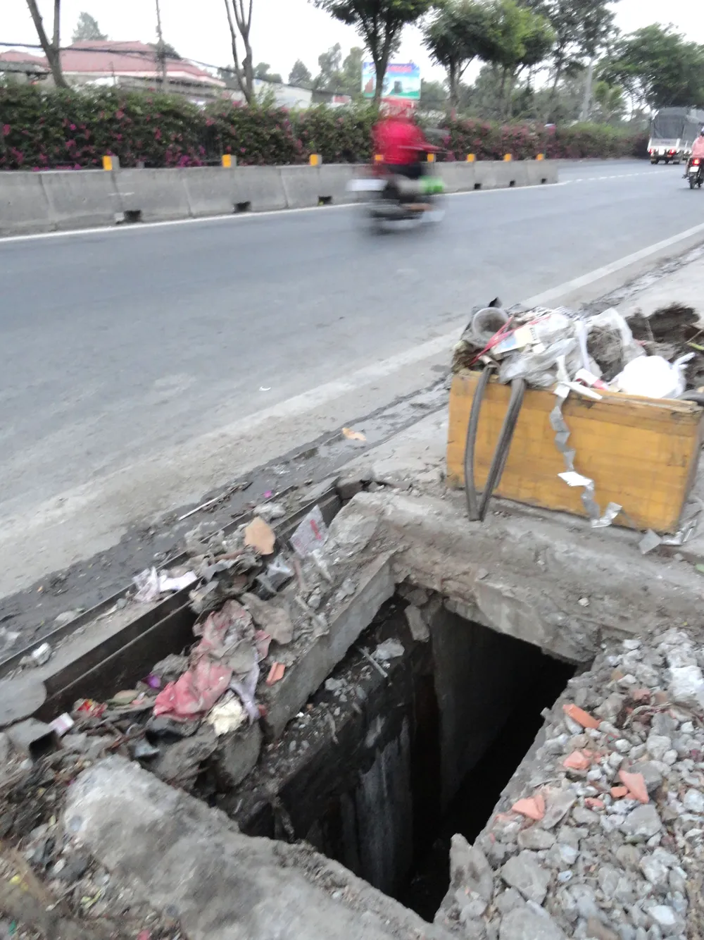 Trên quốc lộ 1A đoạn qua khu phố 2, phường Tam Bình (quận Thủ Đức, TPHCM), có nắp hố ga hỏng tạo thành hố sâu rất nguy hiểm đối với người đi bộ và người đi xe 2 bánh, 3 bánh.
