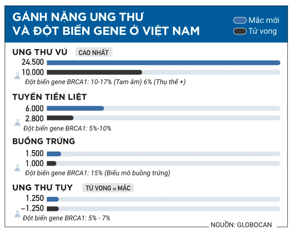 Theo PGS-TS Phạm Cẩm Phương, Giám đốc Trung tâm Y học hạt nhân và Ung bướu, Bệnh viện Bạch Mai (Hà Nội), khoảng 5%-15% trường hợp ung thư liên quan đến yếu tố di truyền, do các đột biến gene bẩm sinh có thể bị kích hoạt bởi môi trường và lối sống. Một số ung thư như vú, buồng trứng, đại trực tràng, tuyến tiền liệt và tụy có liên quan chặt chẽ đến di truyền, điển hình là đột biến gene BRCA1 và BRCA2 làm tăng nguy cơ ung thư vú gấp 5-7 lần.