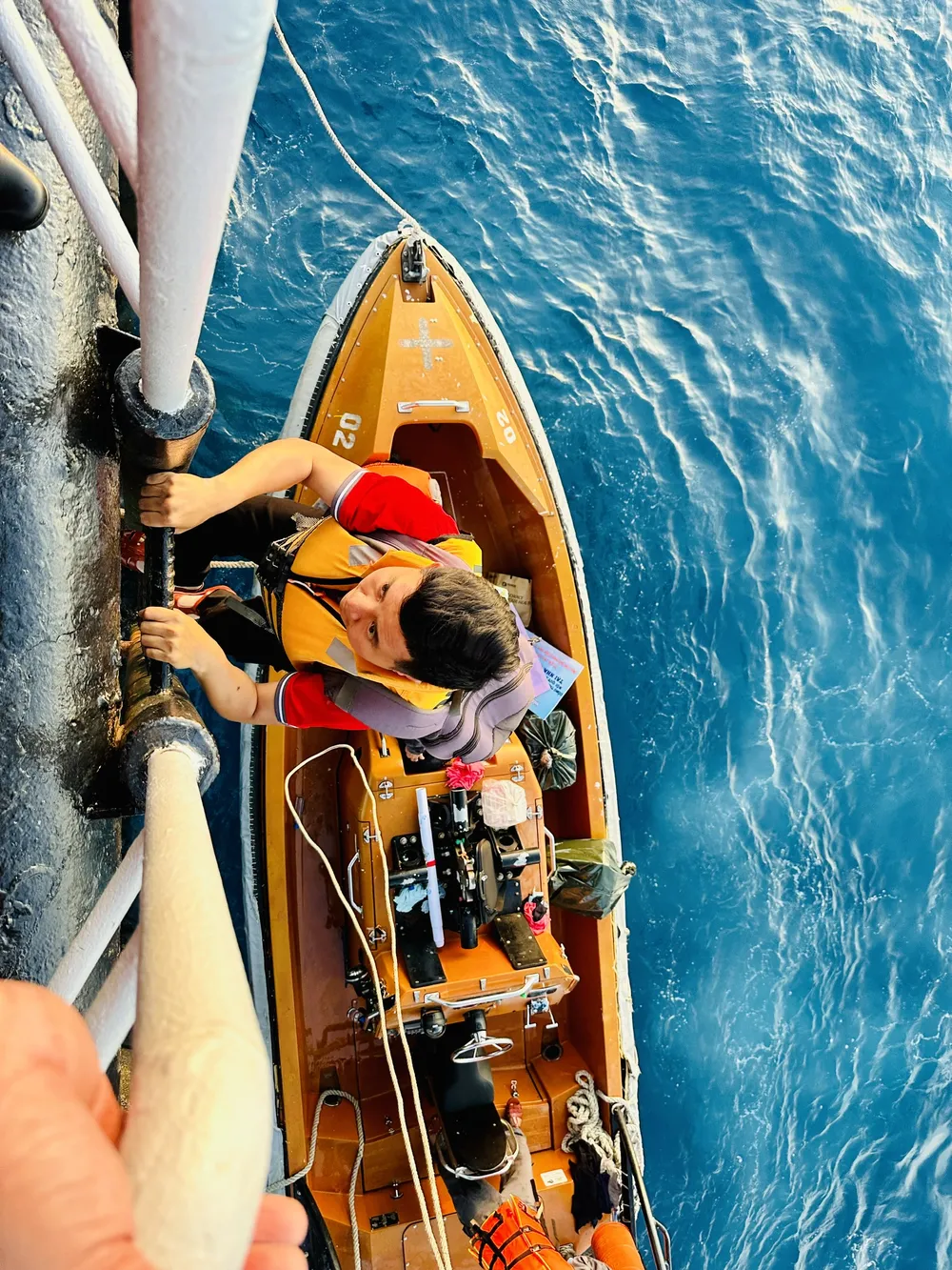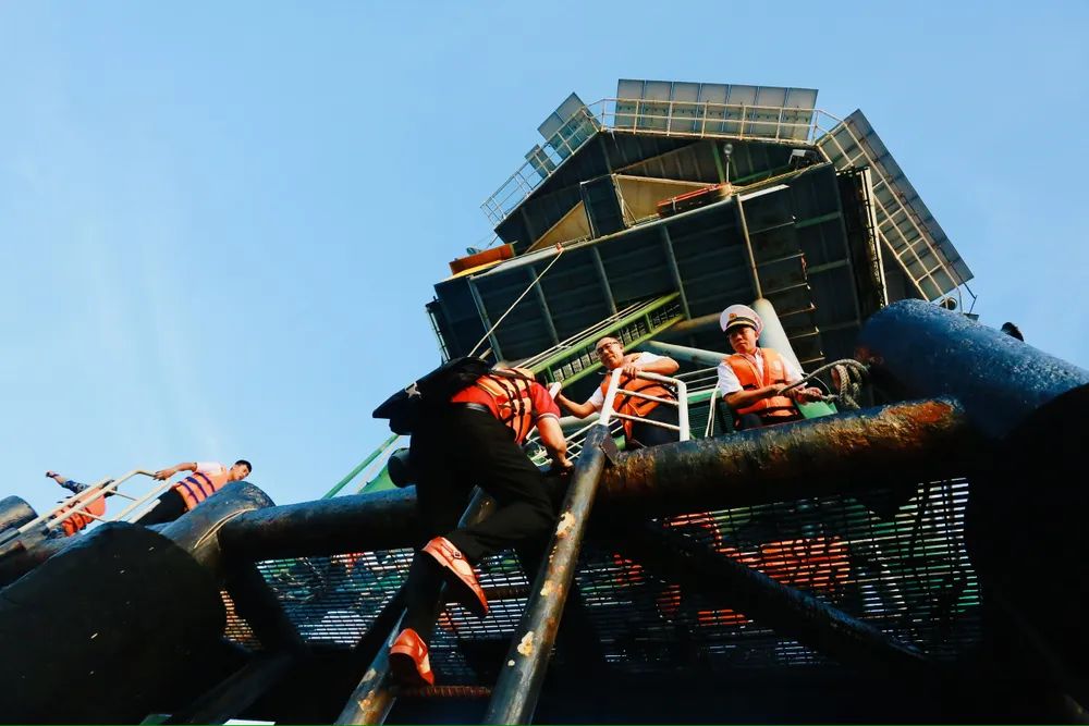 Chủ tịch Ủy ban MTTQ Việt Nam TPHCM Trần Kim Yến di chuyển bằng lối cầu thang sắt để lên thăm cán bộ, chiến sĩ Nhà giàn DK1/10. Ảnh: CHÍ THẠCH |