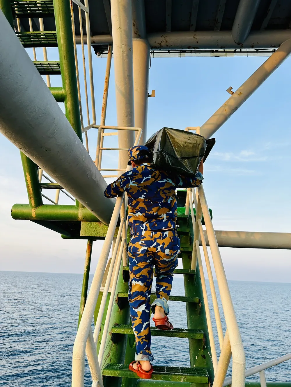 Trung tướng Nguyễn Văn Bổng, Chính ủy quân chủng Hải quân di chuyển bằng lối cầu thang sắt để lên thăm cán bộ, chiến sĩ Nhà giàn DK1/10. Ảnh: CHÍ THẠCH |