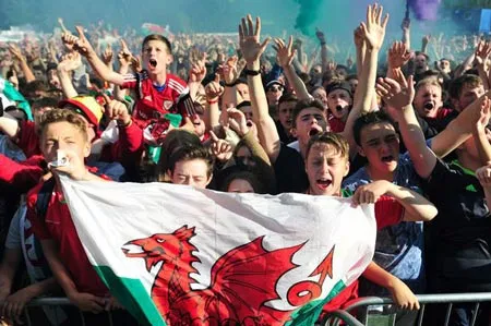 Ở Xứ Wales, các quán bar và nhà hàng khắp nơi, từ Abergele đến Aberystwyth hay Caernarfon và Caerphilly tưng bừng và tràn ngập bia cũng như những lời chúc tụng. Tan trận, tất cả đều xuống đường ăn mừng, để trơ lại những quán hàng với vài nhân viên phục vụ mệt nhoài dọn dẹp… Tại thủ đô Cardiff, hơn 6.000 CĐV đã khuấy động sự náo nhiệt ở khu Fanzone được dựng lên trong công viên Bute. Họ hét đến khản cổ để cổ vũ HLV Chris Coleman và các cầu thủ tiến đến vinh quang.