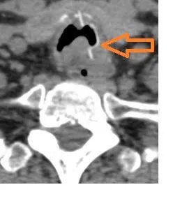 Dị vật nằm dọc khí quản gây biến dạng, phù nề