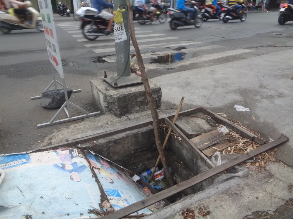 Trên đường Hòa Bình, đoạn ngay Công viên Đầm Sen, phường 3, quận 11, TPHCM, nắp hố ga hỏng từ lâu và nhiều lần thay vật cảnh báo nhưng vẫn chưa được thay nắp mới.