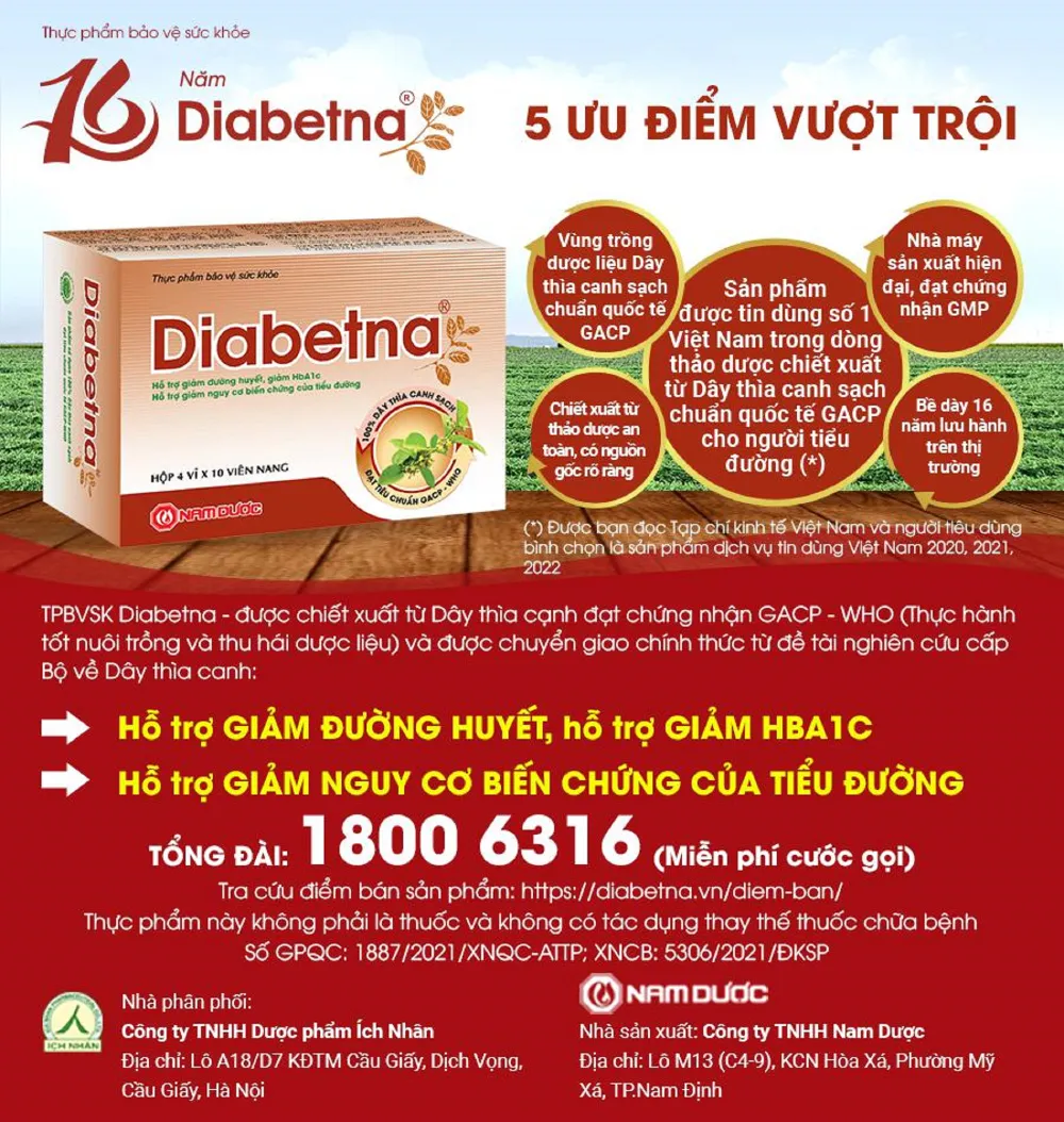 Nhờ lựa chọn hướng phát triển bền vững, Diabetna tự hào trở thành người bạn đồng hành thân thiết của người tiểu đường, là giải pháp hiệu quả giúp quá trình điều trị của người bệnh trở nên nhẹ nhàng hơn, giảm tác dụng phụ của thuốc tây y, tránh làm dao động đường huyết và hạ đường huyết quá mức, ngăn ngừa những biến chứng nguy hiểm.