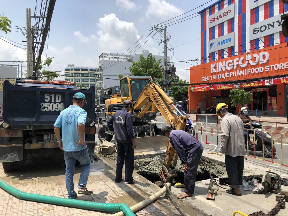 Công nhân của Công ty cổ phần Cấp nước Nhà Bè đang sửa chữa ống nước bị bể phía dưới. Ảnh: C.T