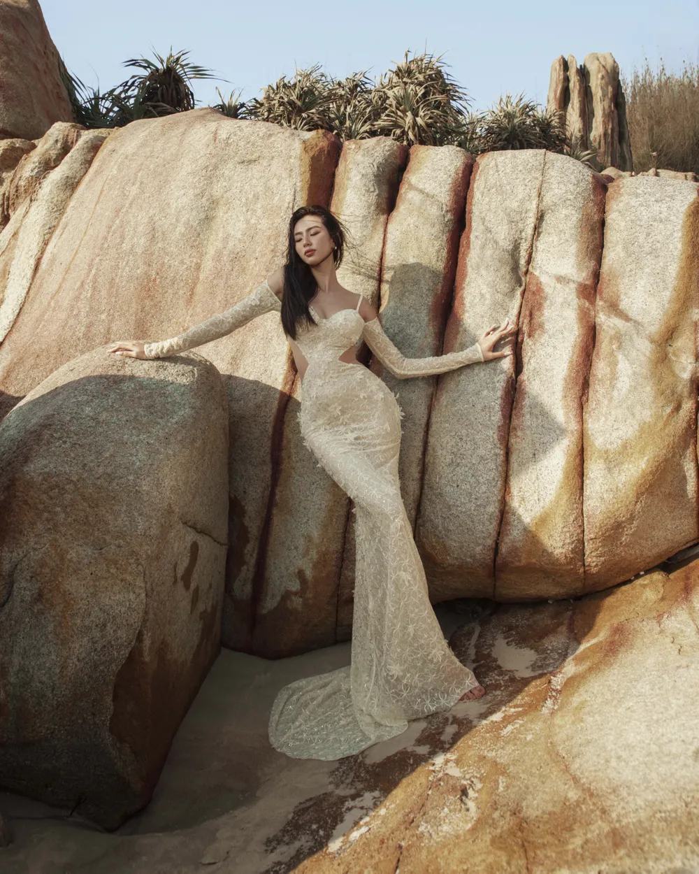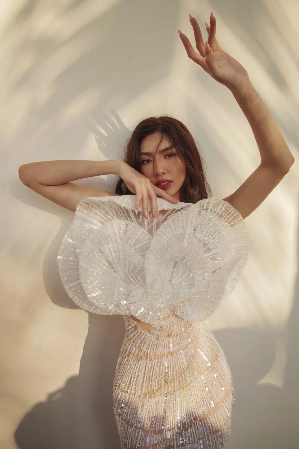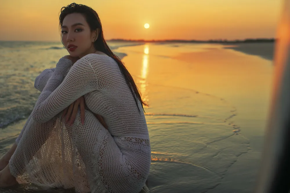 Hoa hậu Hòa bình Quốc tế 2021 (Miss Grand International 2021) Nguyễn Thúc Thùy Tiên tạo dáng quyến rũ bên bờ biển. Người đẹp diện loạt thiết kế mùa hè tươi mát từ BST Shadow của NTK Lê Thanh Hòa.