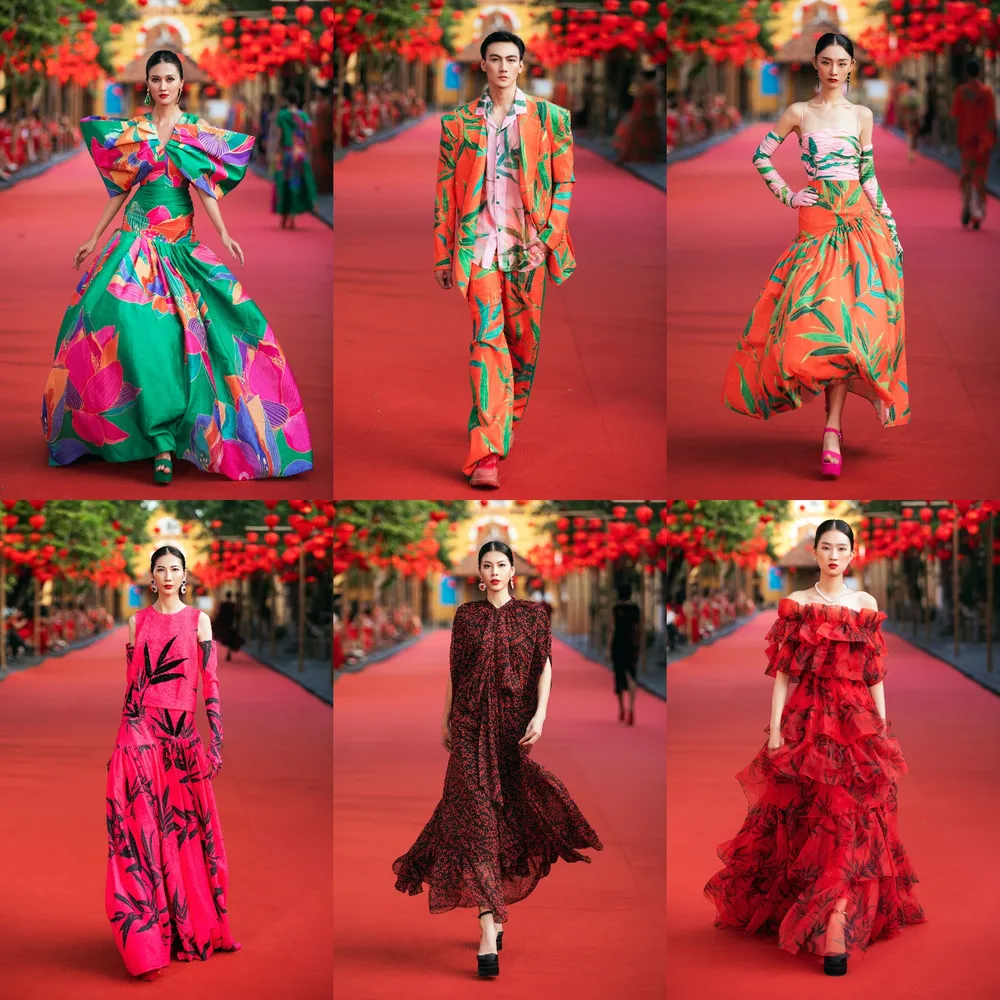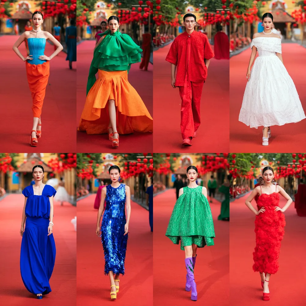 Các tông xanh dương, trắng, xanh lá, hồng… được khai thác ở nhiều sắc độ bên cạnh tông đỏ chủ đạo. Màu xanh da trời nhạt, xanh lá phối cùng sắc cam là biến tấu mới mẻ mà bộ đôi NTK giới thiệu với giới mộ điệu ở BST này.