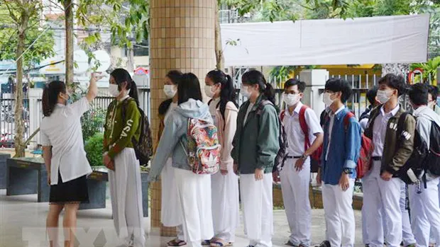 Các học sinh trường THPT Phan Châu Trinh (thành phố Đà Nẵng) xếp hàng đo thân nhiệt trước khi vào lớp. Ảnh: TTXVN