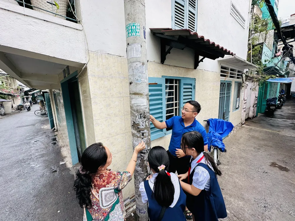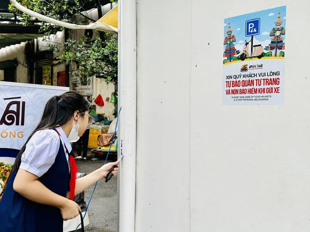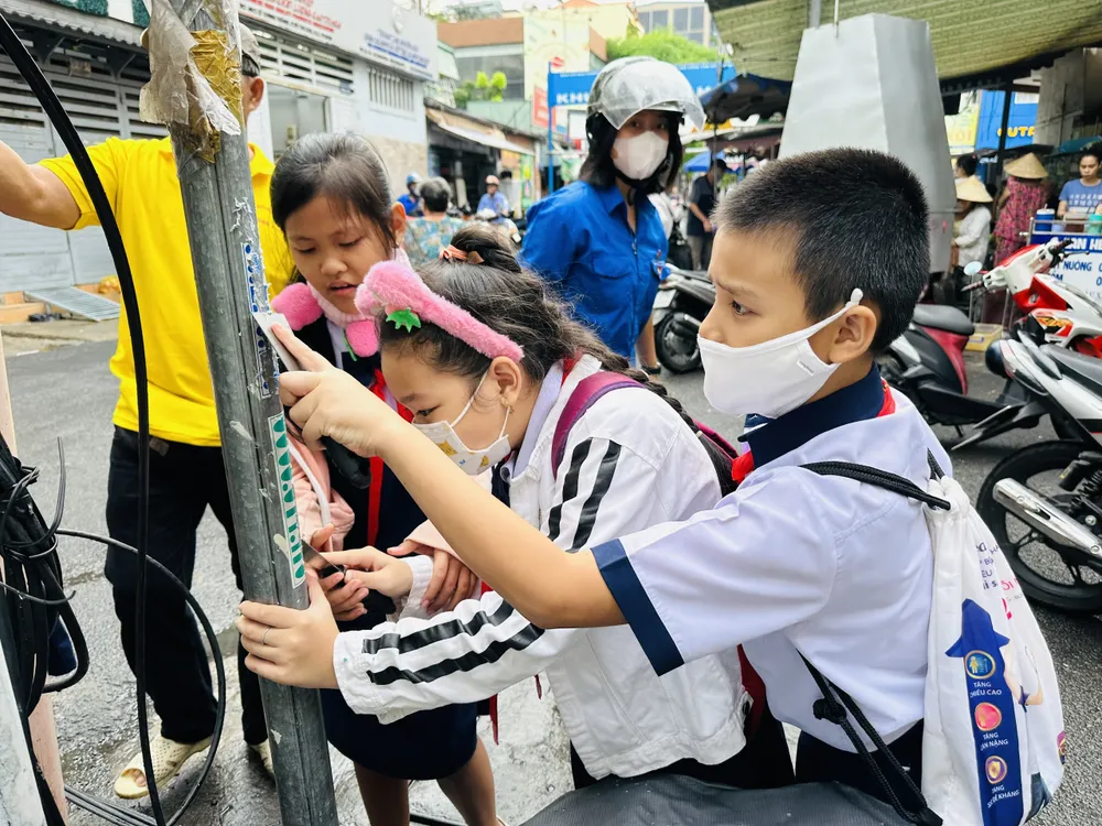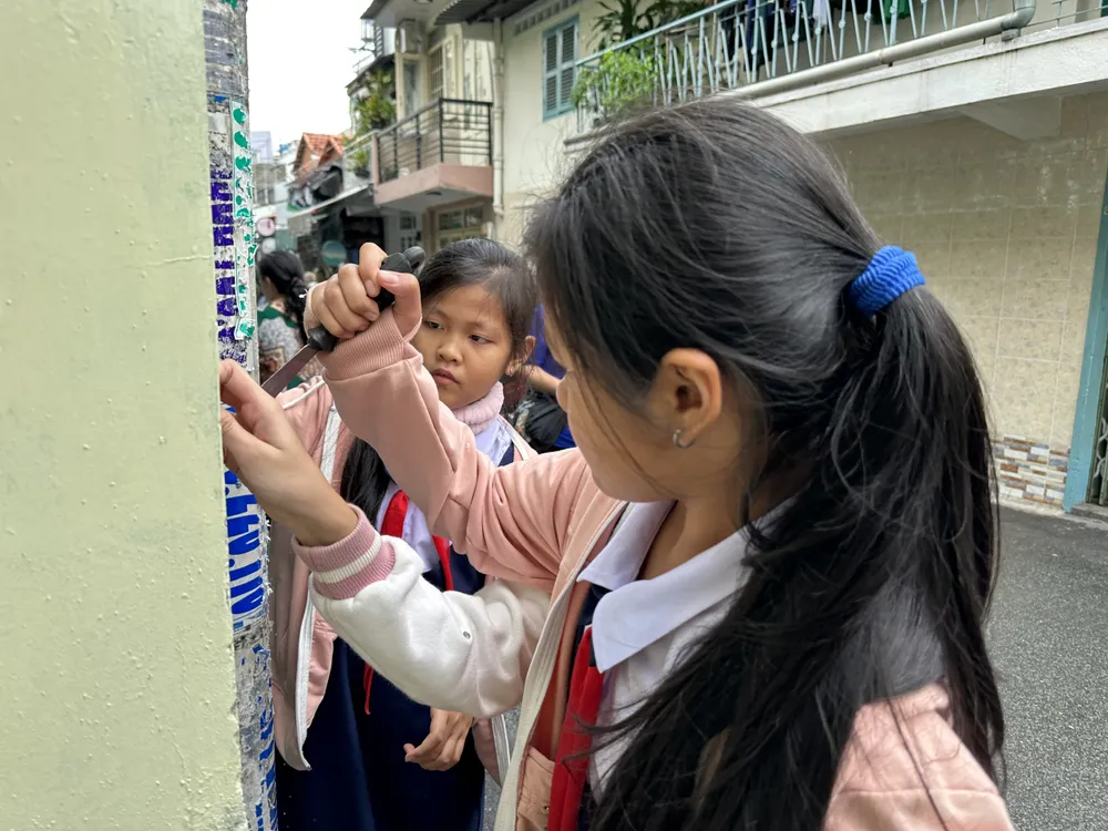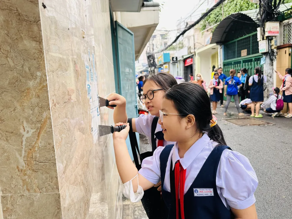 Các em học sinh tham gia bóc, xóa quảng cáo "tín dụng đen" ở từng con đường, tuyến phố. Ảnh: CHÍ THẠCH