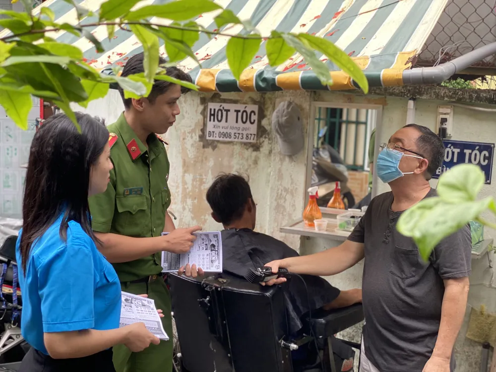 Công an, đoàn viên vào tận nhà dân để phát tờ rơi tuyên truyền. Ảnh: CHÍ THẠCH