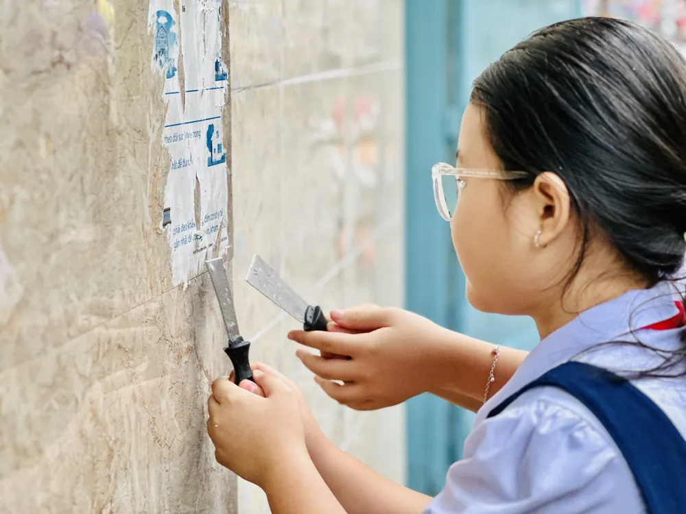 Các em học sinh đang bóc, xóa quảng cáo "tín dụng đen"