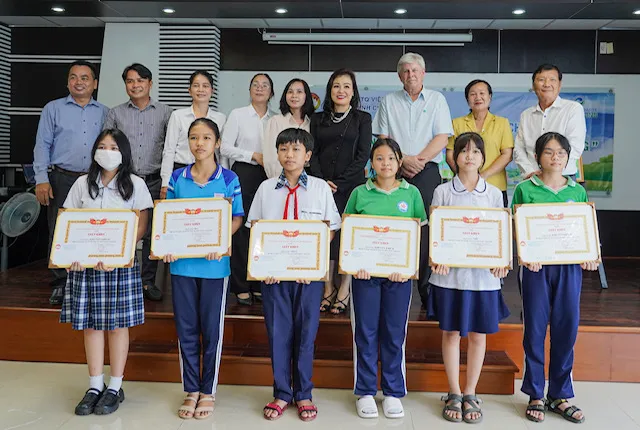 Bà Huỳnh Lan Phương, Phó Tổng Giám đốc VWS trao giải thưởng cho các em đoạt giải vẽ tranh về môi trường
