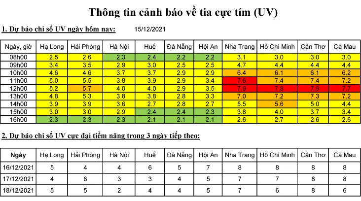 Dự báo trong ba ngày tiếp theo, chỉ số UV cực đại tiềm năng tại khu vực miền Bắc và miền Trung vẫn duy trì ở ngưỡng nguy cơ gây hại trung bình, ngoại trừ Hải Phòng (17-12), Huế (16-12) và Nha Trang ở mức nguy cơ cao; đối với các thành phố miền Nam, chỉ số này tiếp tục ở ngưỡng nguy cơ gây hại cao.