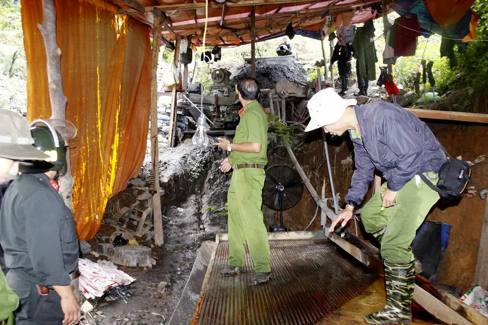 Tại hiện trường, lực lượng chức năng phát hiện một hầm thiếc sâu khoảng 70m đào vào lòng núi, 8 lán trại, cùng hàng chục máy móc, thiết bị phục vụ việc khai thác thiếc trái phép.