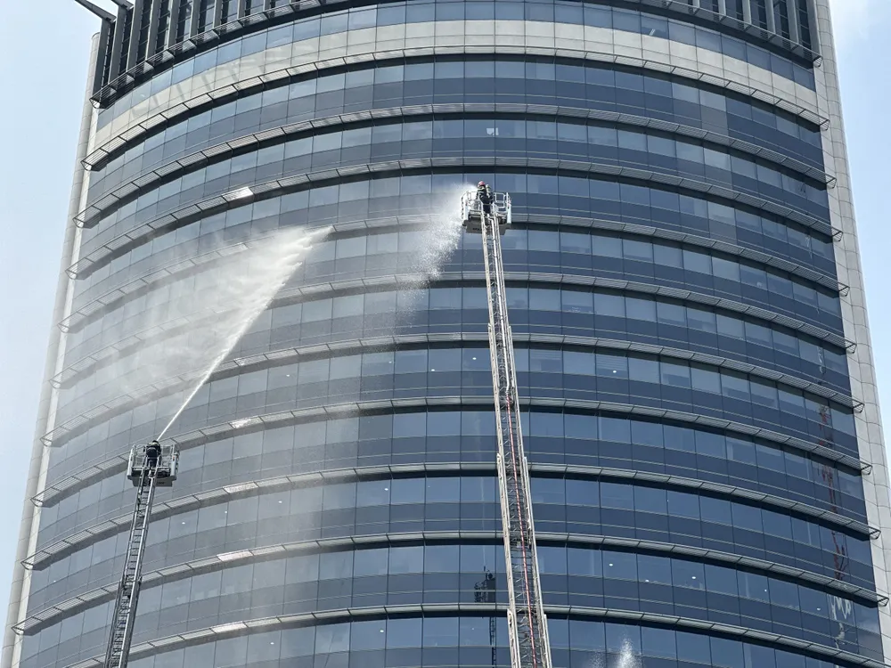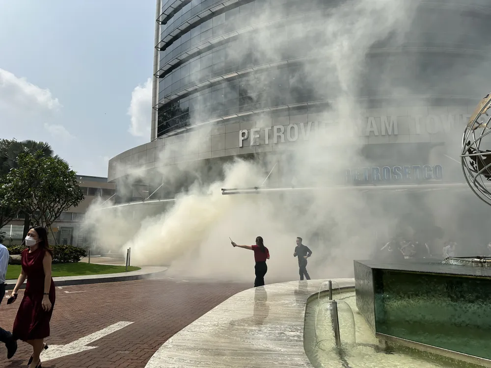 Khói lửa bùng cháy giả định tại tòa nhà PetroVietnam Tower. Ảnh: CHÍ THẠCH |