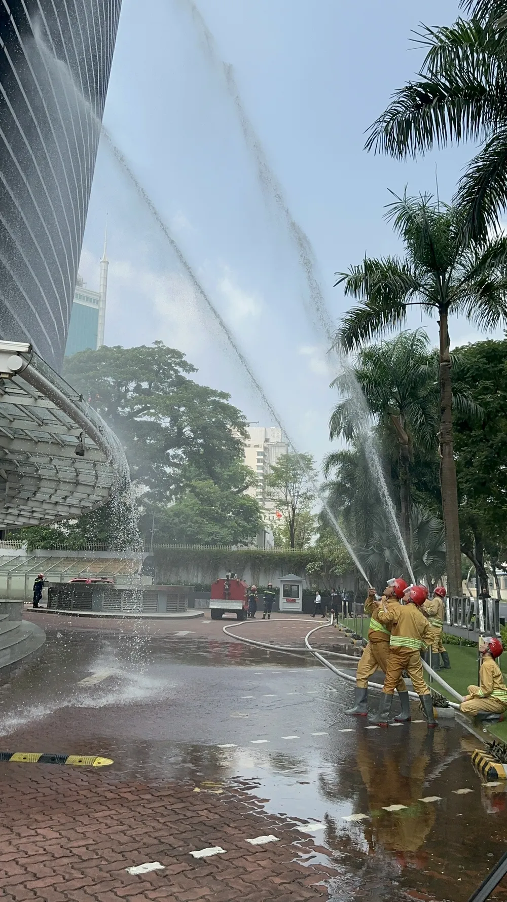 Đồng thời, lực lượng chức năng dùng xe thang tiếp cận từ trên cao để chữa cháy và giải cứu nhiều người mắc kẹt ở các tầng cao. Bên cạnh đó, các tổ khác tiếp cận thang máy dùng kiềm thủy lực, máy cắt… để cứu người mắc kẹt đưa ra ngoài chuyển cấp cứu.