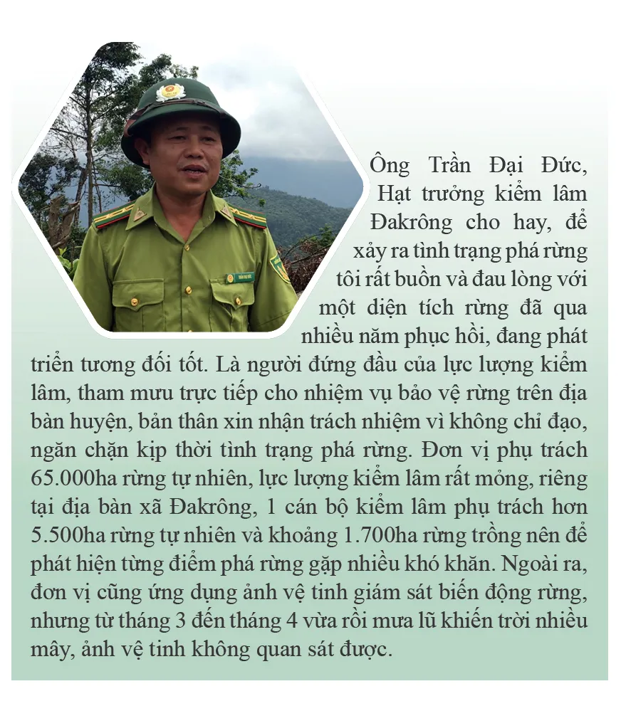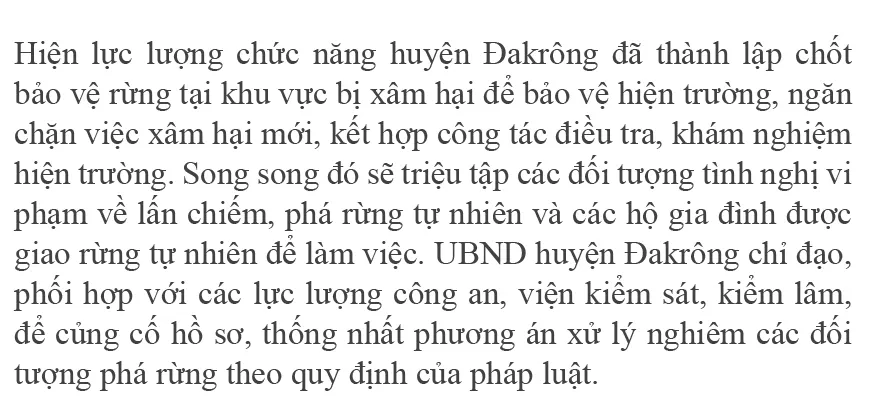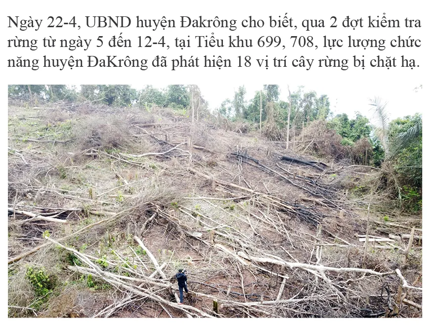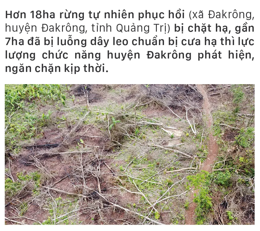 Hơn 18ha rừng tự nhiên phục hồi (xã Đakrông, huyện Đakrông, tỉnh Quảng Trị) bị chặt hạ, gần 7ha đã bị luỗng dây leo chuẩn bị cưa hạ thì lực lượng chức năng huyện Đakrông phát hiện, ngăn chặn kịp thời.