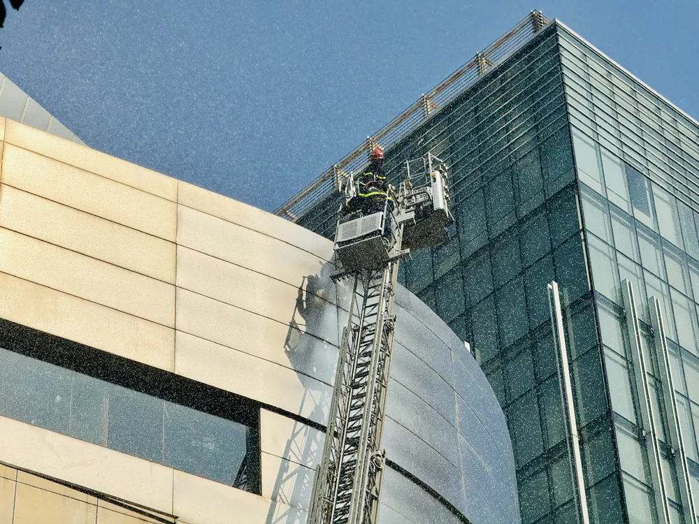 Từ tầng cao của tòa nhà phun nước khi phát hiện cháy từ tầng dưới |